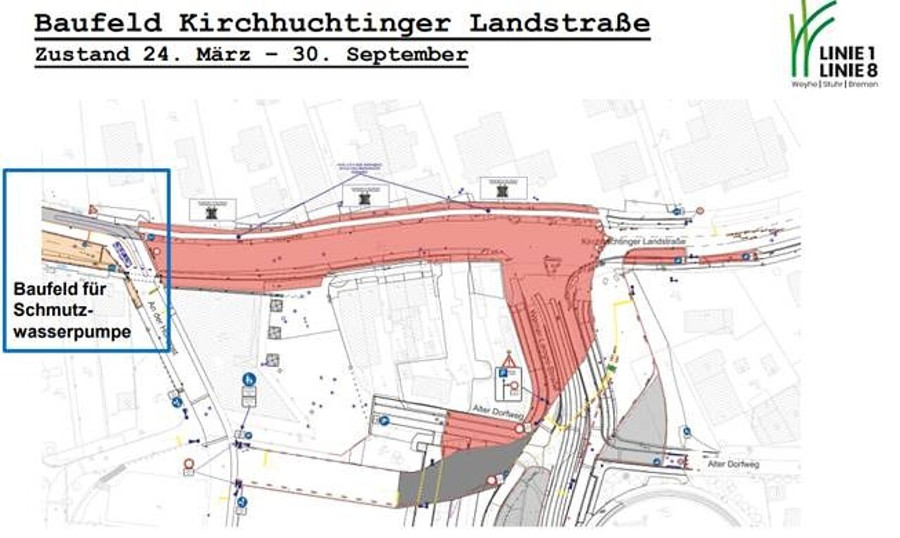 Der nächste Bauabschnitt der Linie 1 ist gestartet: seit Mittwoch, den 26.03. ist die Kirchhuchtinger Landstraße zwischen Werner-Lampe-Straße und An der Höhpost voll gesperrt.